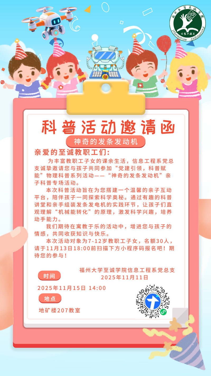 为丰富教职工子女的课余生活,信息工程系党总支诚挚邀请您与孩子共同参加“党建引领,科普赋能”物理科普系列活动--“神奇的发条发动机”亲子科普专场活动。