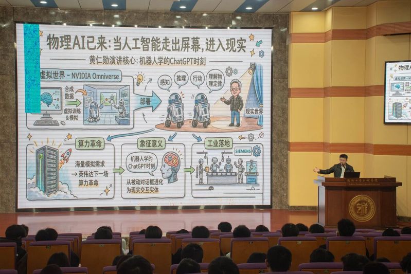 会议核心环节聚焦 AI 产业变革,为信息工程专业学子解析行业趋势与发展机遇。辅导员围绕黄仁勋国际电子消费展主题演讲,详解计算机工业正经历 CPU 转 GPU、手动编程转模型训练的两大转移,并引入“物理 AI” 新概念 ,结合 Cosmos 基础模型、Vera Rubin算力平台及 Alpamayo 自动驾驶模型的案例,阐释技术落地逻辑与开源战略意图。